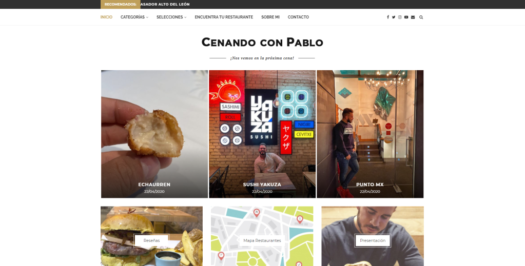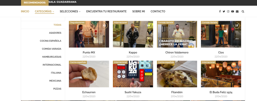 En el apartado «categorías» nos ofrece una gama de estilos de comida, en función del tipo de restaurante que quieras visitar, escogerás uno u otro subapartados. Asadores, cocina española, italiana o hamburguesas son algunas de ellas. También existe el apartado «todas» por si te encuentras indeciso y estás abierto a probar todo tipo de recetas. Puntualizar que todas las fotografías de las reseñas llevan la nota que Pablo otorga al restaurante. De esta manera, si buscas, por ejemplo, la mejor hamburguesería en la que nuestro entrevistado ha estado, no tendrás que leer todos los artículos, echando una ojeada a las fotos que acompañan las reseñas ya podrás discernir cuales te interesan más.